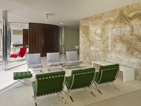 In front of the onyx wall, two Barcelona chairs and a Barcelona stool are upholstered in green (a departure from the typical black and white) to mimic the exterior surroundings. A trio of silver-gray Tugendhat chairs — one of the chairs designed specifically for the home — sit just across from them. Also part of the Barcelona series, which Mies created to furnish his German Pavilion for the 1929 Barcelona International Exposition, the red chaise longue adds a pop of color. The seven floor-to-ceiling windowpanes are the exact copies of the 1930s originals, including the two fully retractable windows, further blurring the distinction between indoors and outdoors.