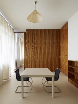 Behind the onyx wall and next to the adjoining winter garden, the study and library includes a Tugendhat chair in peach leather and two woven MR20, or Stuttgart, chairs at Fritz's desk. The MR20, also in the entry hall and in the nanny's room, was created for Mies's contribution to the Weissenhof housing estate in Stuttgart. The built-in bookcase, featuring the original panels (its shelves, with the exception of one preserved original, were made in the exact replica) is veneered in the same Macassar ebony as the dining room's partition.