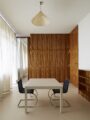 The rounded Macassar partition is the star among the home's use of exotic woods. Its panels, which disappeared from the main living room in 1940, were later discovered in the cafeteria of the Faculty of Law at Brno's Masaryk University. where the Gestapo had its base during the war. After more than 70 years, these elements were returned to their original place. The partition follows the shape of the Mies-designed polished pearwood dining table and its set of 15 white leather Brno chairs, which were designed specifically for the house.