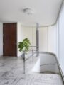 The entrance hall is paved in Italian travertine floors and features a rounded milk-glazed wall that bathe the space in natural light.